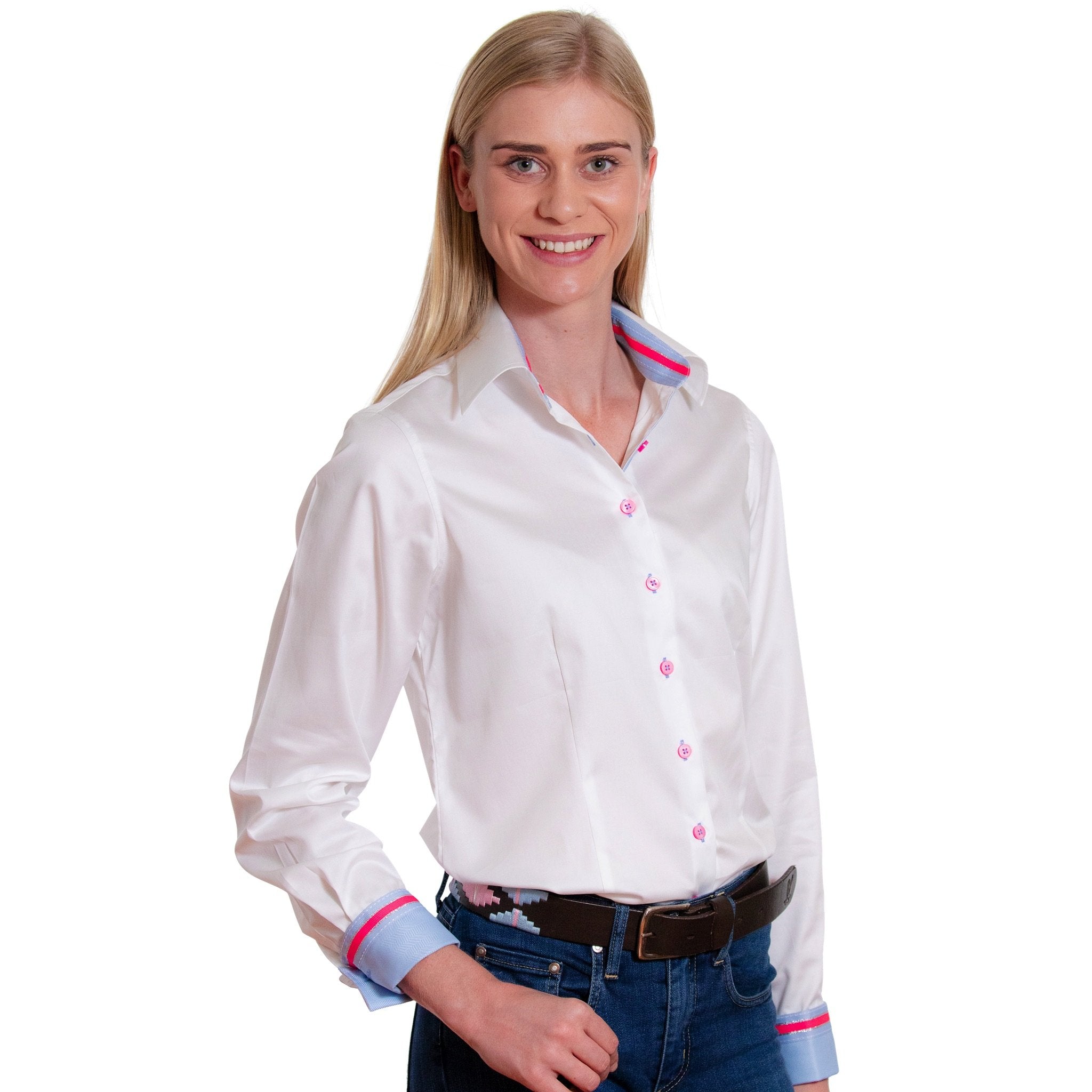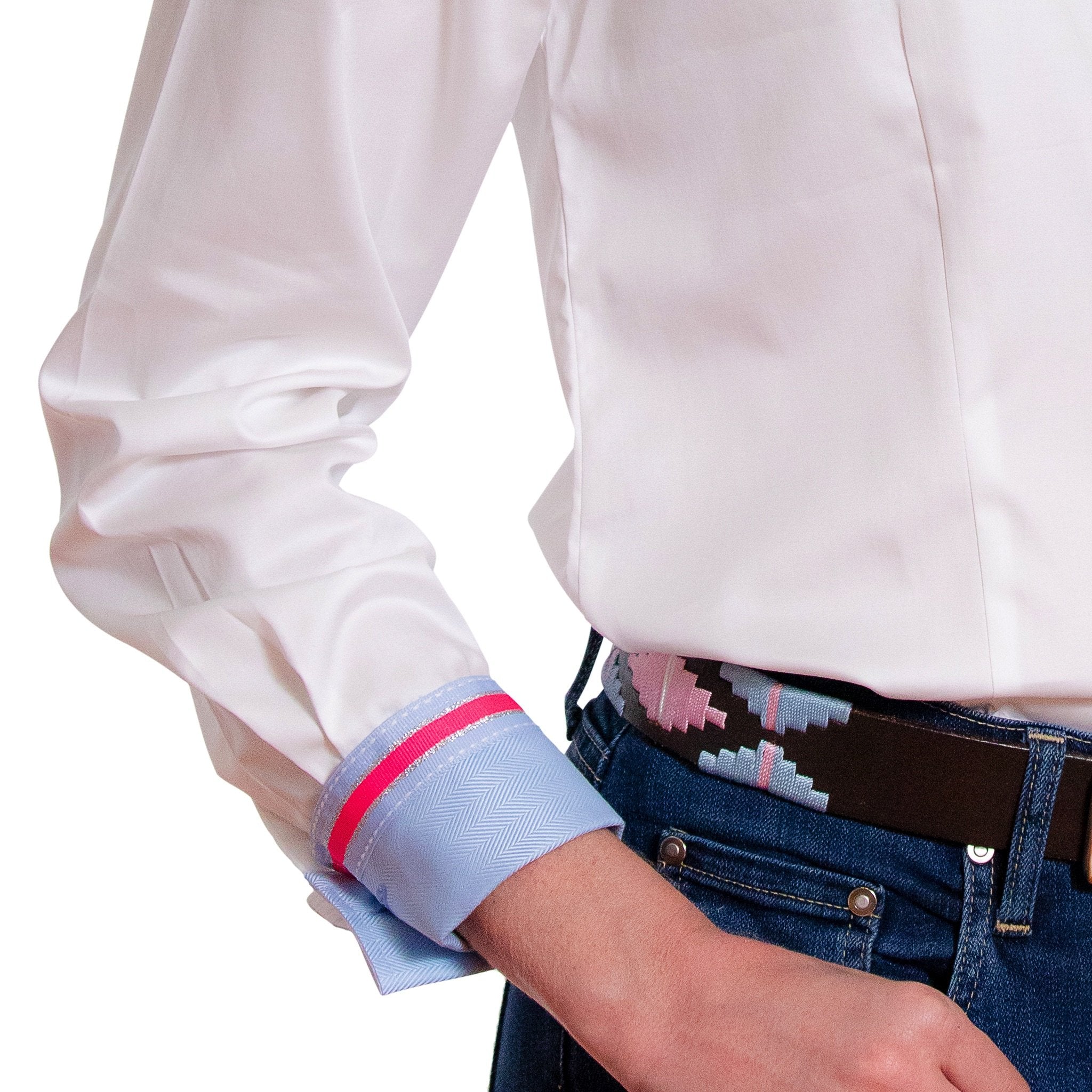 - High-contrast trim at collar stand, inner cuffs and placket